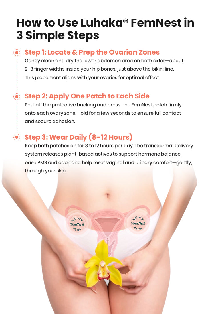 Apply one patch to each side of your lower abdomen—right where your ovaries sit. This targeted placement brings gentle, balancing support to your body’s hormone centers, helping stabilize vaginal flora, reduce inflammation, and regulate your cycle.